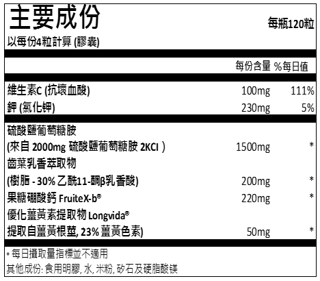 - 含形成膠原蛋白必需的維生素C,膠原蛋白是在關節之間的軟骨形成關鍵成分